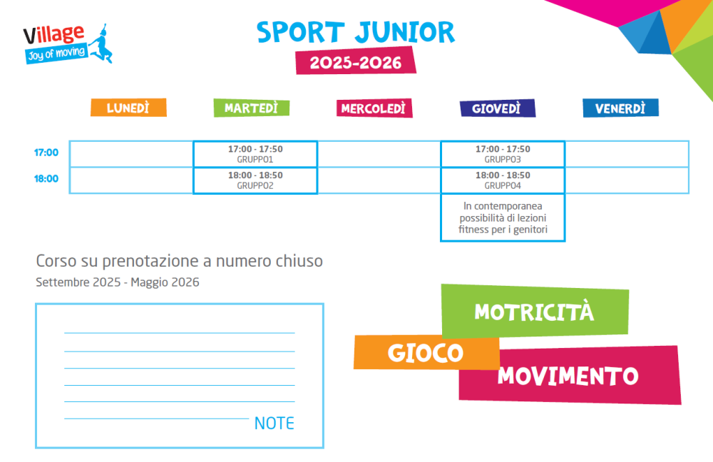 I piccoli, seguiti dagli istruttori del Village, potranno sperimentare in completa sicurezza salti e lanci, giochi di equilibrio e movimento a corpo libero, utilizzando diversi attrezzi e materiali per sviluppare le abilità motorie di base. Grazie ad attività coinvolgenti e divertenti, svilupperanno la loro creatività e consolideranno le abilità di vita, le relazioni con gli altri, l’autoregolazione, il rispetto delle regole, l’autonomia.