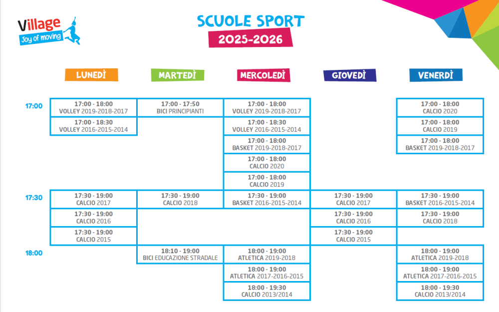 Le attività delle Scuole di Sport mirano a lasciare libera interpretazione alle situazioni di gioco e a rimandare all’età più consona la specializzazione, favorendo un approccio sereno e disteso alla pratica sportiva, all’insegna della Joy of moving.